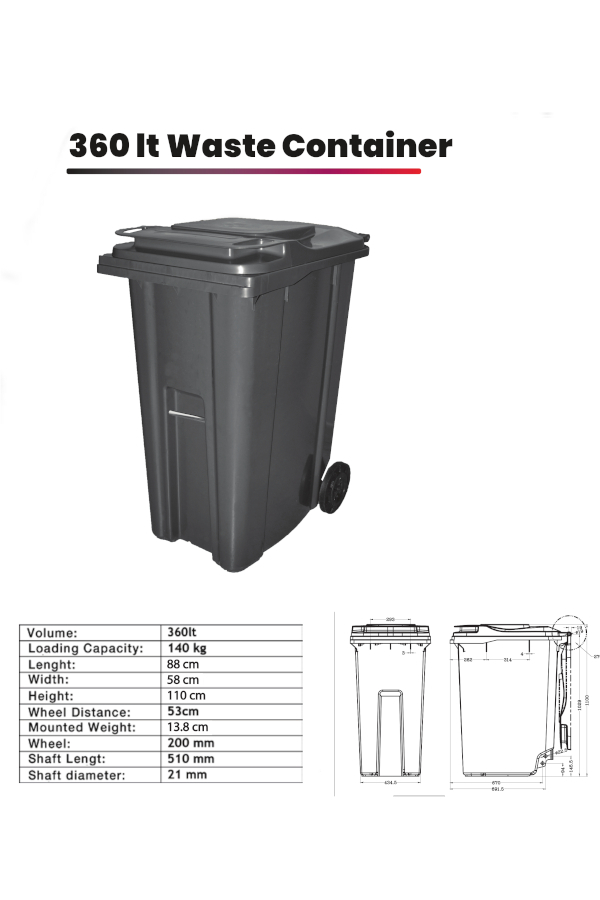 Ανθεκτικός κάδος απορριμμάτων χωρητικότητας 360 λίτρων, ιδανικός για χρήση σε εξωτερικούς χώρους, δημόσιους χώρους, επαγγελματικά κτίρια και δήμους. Κατασκευασμένος από υψηλής ποιότητας πολυαιθυλένιο (HDPE), με μεγάλη αντοχή σε ήλιο, ζέστη, κρύο και χτυπήματα.